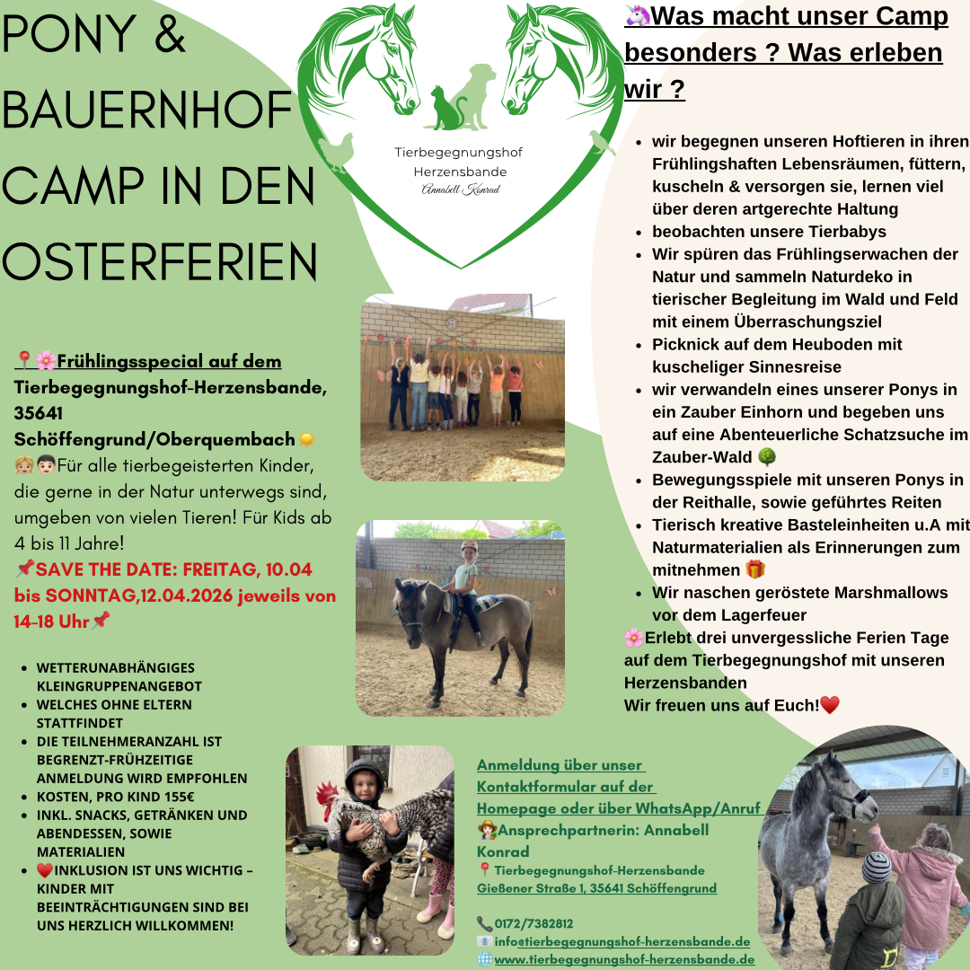 In den Herzensbande Ponyzwerge (3–6 Jahre) und Ponykobolde (7–11 Jahre) treffen sich kleine Gruppen in unserer wetterunabhängigen Therapiehalle – je nach Anmeldung ab drei Kindern. Angeboten wird ein ganzheitliches Erlebnis mit Reiten, Pflege, Füttern, Basteln und Bewegung – ideal für kindgerechte frühpädagogische Förderung.